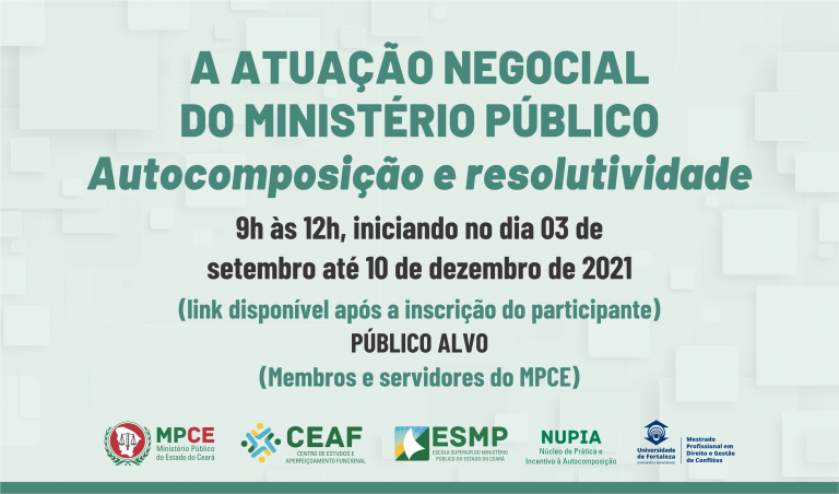 O Ministério Público do Estado do Ceará (MPCE) promove, de 3 de setembro a 10 de dezembro, o curso “A atuação negocial do Ministério Público – Autocomposição e resolutividade”. Com uma carga horária de 45 horas/aula, a formação é voltada para membros e servidores do MPCE, com encontros virtuais. São 40 vagas disponíveis e as […]