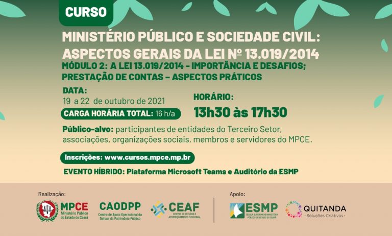 Inicia-se, nesta terça-feira (19/10), o módulo II do curso “Ministério Público e Sociedade Civil: aspectos gerais da Lei nº 13.019/2014”. A capacitação, promovida pelo Ministério Público do Estado do Ceará (MPCE), por meio do Centro de Apoio Operacional de Defesa do Patrimônio Público (CAODPP) e do Centro de Estudos e Aperfeiçoamento Funcional (CEAF), concluiu, no dia 24 de setembro, seu […]