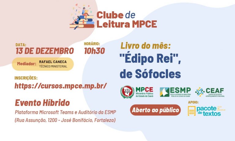 Imagine a seguinte profecia: um filho irá matar seu pai e casar com a própria mãe. À primeira vista, isso parece, no mínimo, bem absurdo, não é verdade? Pois esse é o mote do livro “Édipo Rei”, obra escrita pelo dramaturgo grego Sófocles por volta de 427 a.C. e que será discutida no 5º Encontro do Clube de Leitura MPCE. A quinta […]