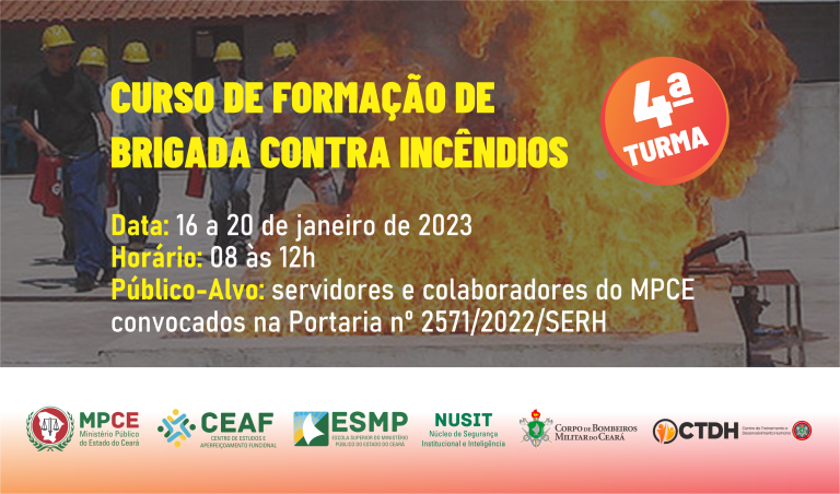 O Ministério Público do Estado do Ceará (MPCE), por meio do Centro de Estudos e Aperfeiçoamento Funcional (CEAF), da Escola Superior do Ministério Público (ESMP) e do Núcleo de Segurança Institucional e Inteligência (Nusit), promove, entre os dias 16 e 20 de janeiro, das 8h às 12h, o Curso de Formação de Brigada contra Incêndios – 4ª turma. O curso, que terá 20 horas/aula, tem como objetivo capacitar […]