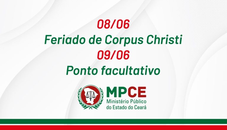O procurador-geral de Justiça, Manuel Pinheiro, decretou ponto facultativo para membros, servidores, estagiários e colaboradores do Ministério Público do Estado do Ceará (MPCE) na próxima sexta-feira (09/06), data que sucede o feriado de Corpus Christi (08/06). A medida foi anunciada na Portaria nº 0941/2023/SEGEP, assinada pelo PGJ nessa terça-feira (06/06). Na data apontada, ficarão suspensos […]