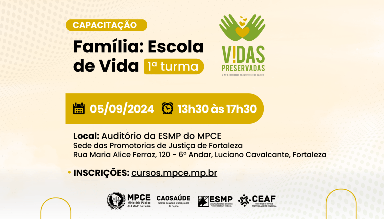 O Ministério Público do Estado do Ceará irá realizar nesta quinta-feira (05/09), das 13h30 às 17h30, mais uma edição da capacitação “Família: Escola de Vida”, abordando temas como posvenção ao suicídio e valorização da vida. A capacitação terá 4h/a, será aberta ao público e ocorrerá no Auditório da ESMP, em Fortaleza. A iniciativa é realizada […]