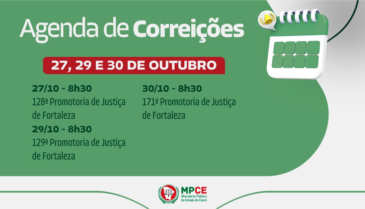 As correições, que têm início sempre às 8h30, ocorrerão na 128ª Promotoria de Justiça de Fortaleza (27/10), na 129ª Promotoria de Justiça de Fortaleza (29/10) e na 171ª Promotoria de Justiça de Fortaleza (30/10). A Corregedoria-Geral do MP convida a população destes municípios a comparecer na sede das Promotorias de Justiça, nos dias e horários marcados, para contribuir com sugestões para a melhoria dos serviços do Ministério Público.