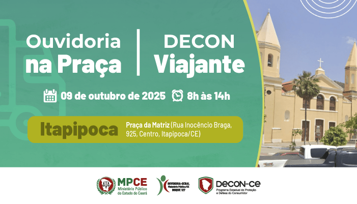 O Ministério Público do Ceará promoverá, no dia 09 de outubro, das 8h às 14h, mais uma edição do projeto Ouvidoria na Praça, dessa vez no município de Itapipoca. A ação levará informações sobre as atribuições do MP e de suas unidades ministeriais especializadas e o Decon Viajante com atendimento ao consumidor, além de prestação de serviços assistenciais e cuidados com a saúde.
