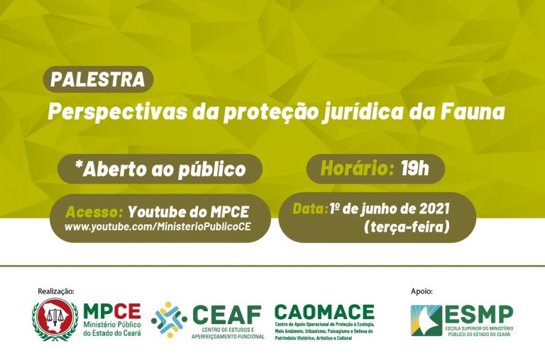 O Ministério Público do Estado do Ceará (MPCE), por meio do Centro de Estudos e Aperfeiçoamento Funcional (CEAF) e do Centro de Apoio Operacional do Meio Ambiente (Caomace), promove hoje (01/06), às 19h, uma palestra com o tema “Perspectivas da proteção jurídica da Fauna”. O evento, em alusão ao Dia Mundial do Meio Ambiente, comemorado no dia 5 […]