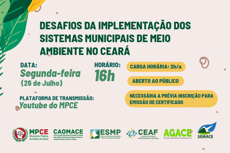 O Ministério Público do Estado do Ceará (MPCE) vai realizar, nesta segunda-feira (26/07), evento sobre “Desafios da implementação dos sistemas municipais de meio ambiente no Ceará”. O debate é aberto ao público e acontecerá às 16h, com transmissão on-line através do canal do Youtube do MPCE. A iniciativa é do Centro de Apoio Operacional do Meio Ambiente (Caomace), do Centro de […]