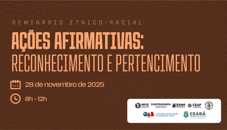 O Ministério Público do Ceará realizará, no dia 28 de novembro, a partir das 8h, o “Seminário Étnico-Racial – Ações Afirmativas: Reconhecimento e Pertencimento”, no auditório da Procuradoria Geral de Justiça, em Fortaleza. A iniciativa é promovida pelo Centro de Apoio Operacional da Cidadania (Caocidadania) e pelo Centro de Estudos e Aperfeiçoamento Funcional (Ceaf), com […]