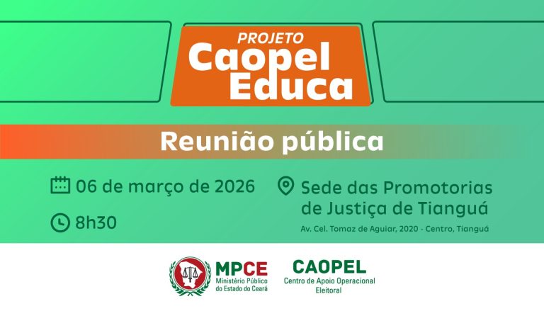 O Ministério Público do Ceará, por meio do Centro de Apoio Operacional Eleitoral (Caopel), dará início, no dia 06 de março, em Tianguá, às ações do projeto Caopel Educa. A iniciativa tem como foco o combate à corrupção, ao assédio eleitoral e à violência política de gênero, fortalecendo a legitimidade da democracia. A reunião, direcionada […]