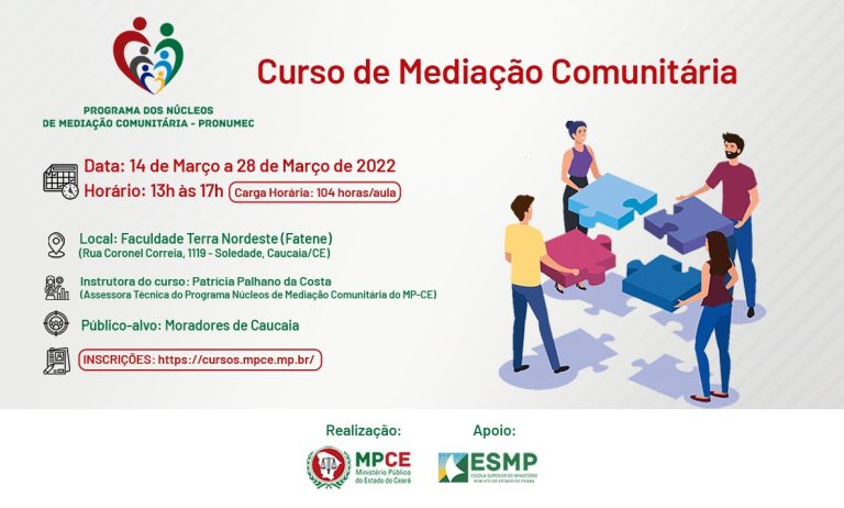 A Coordenação dos Núcleos de Mediação Comunitária do Ministério Público do Estado do Ceará (MPCE), por meio do Centro de Estudos e Aperfeiçoamento Funcional (CEAF) e com o apoio da Escola Superior do Ministério Público (ESMP), promoverá nesta segunda-feira (11/03), o Curso de Mediação Comunitária em Caucaia na Faculdade Terra Nordeste (Fatene), localizada na Rua Coronel Correia, 1119 – Soledade. Ao todo, a […]