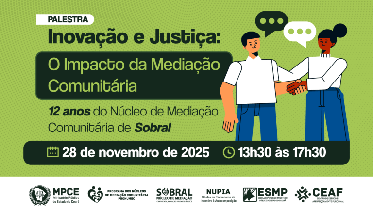 O Ministério Público do Ceará promoverá no dia 28 de novembro, das 13h30 às 17h30, a palestra “Inovação e Justiça: o impacto da Mediação Comunitária”. O evento ocorrerá na sede do Núcleo de Mediação Comunitária (Numec) de Sobral, no prédio da Cadeia Criativa, e vai celebrar os 12 anos de criação do serviço na cidade. […]