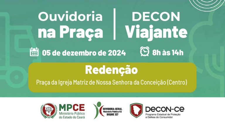 O Ministério Público do Estado do Ceará levará ao município de Redenção, no dia 5 de dezembro, mais uma edição dos projetos Ouvidoria na Praça e Decon Viajante. A ação, que ocorrerá das 8h às 14h, na praça da Igreja Matriz de Nossa Senhora da Conceição, levará informações sobre as atribuições do MP do Ceará […]