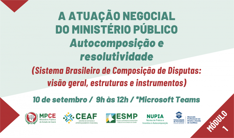 Nesta sexta-feira (10/09), das 9h às 12h, o Ministério Público do Estado do Ceará (MPCE) dá continuidade ao curso “A atuação negocial do Ministério Público – Autocomposição e resolutividade”, com a disciplina do módulo 1 sobre ”Sistema Brasileiro de Composição de Disputas: visão geral , estruturas e instrumentos”, ministrada pelo professor Diego Faleck, doutor em Direito pela Universidade de São Paulo (USP) e mestre […]