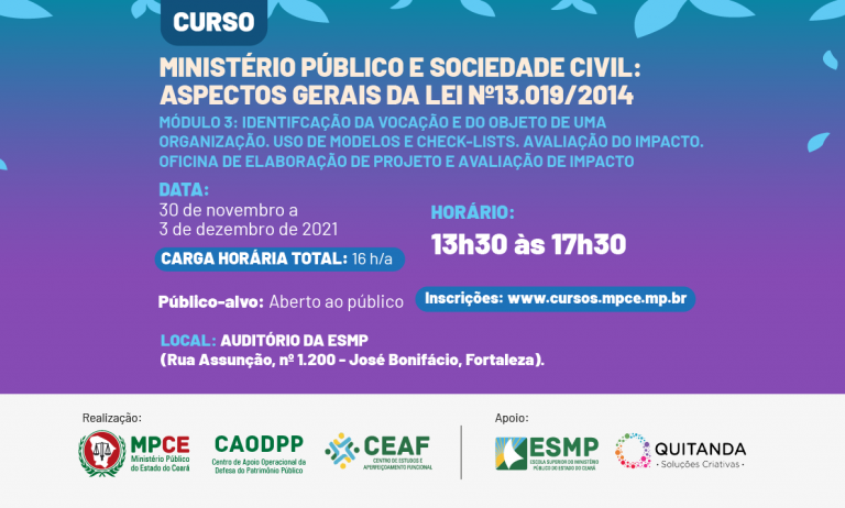 Inicia, na próxima terça-feira (30/11), o Módulo III do curso “Ministério Público e Sociedade Civil: aspectos gerais da Lei nº13.019/2014”. A formação, promovida pelo Ministério Público do Estado do Ceará (MPCE), por meio do Centro de Apoio Operacional de Defesa do Patrimônio Público (CAODPP) e do Centro de Estudos e Aperfeiçoamento Funcional (CEAF), ocorrerá entre os dias 30 de novembro e 03 de dezembro de 2021, de 13h30 às 17h30. Diferente dos dois […]