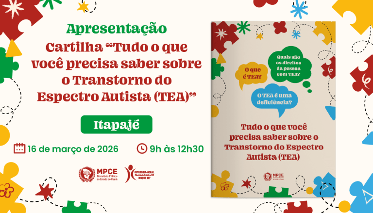 O Ministério Público do Ceará realizará, no dia 16 de março, a apresentação da cartilha “Tudo o que você precisa saber sobre o Transtorno do Espectro Autista – TEA”, em Itapajé. A ação, que será aberta ao público, ocorrerá das 9h às 12h30 no auditório da Câmara Municipal. O material será apresentado pela ouvidora-geral do […]