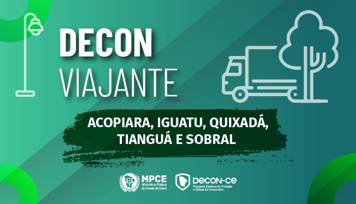 O Programa Estadual de Proteção e Defesa do Consumidor (Decon), do Ministério Público do Ceará, realizará mais uma edição do projeto Decon Viajante nos dias 11, 12, 13, 16, 17 e 18 de março, nos municípios de Acopiara, Iguatu, Quixadá, Tianguá e Sobral, respectivamente. As equipes do Decon prestarão atendimento à população, das 8h às 16h, oferecendo diversos serviços como renegociação de dívidas, consultas a serviços de proteção ao crédito (SPC/Serasa) e atendimento jurídico gratuito.