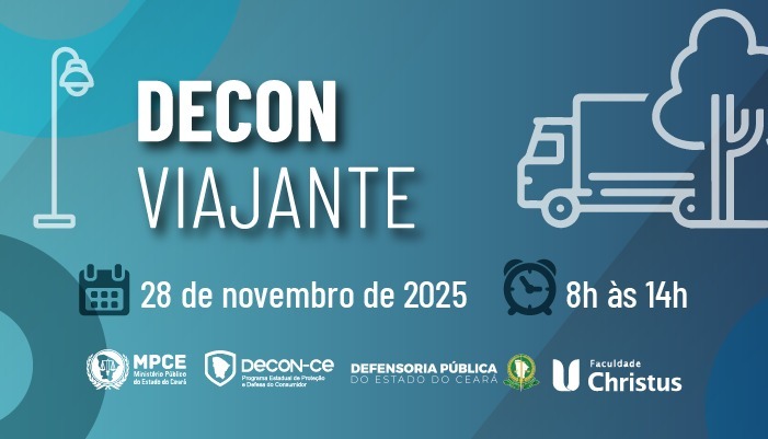 O Ministério Público do Ceará, por meio do Programa Estadual de Proteção e Defesa do Consumidor (Decon), realizará mais uma edição do projeto Decon Viajante no município de Eusébio, na Região Metropolitana de Fortaleza. A ação tem como objetivo promover cidadania e acesso à justiça de forma descentralizada e acolhedora. O evento acontecerá na quinta-feira, 28 de novembro de 2025, a partir das 8h, no Polo de Lazer Ivens Dias Branco, localizado na Rua Irmã Ambrosina, nº 944, Centro.