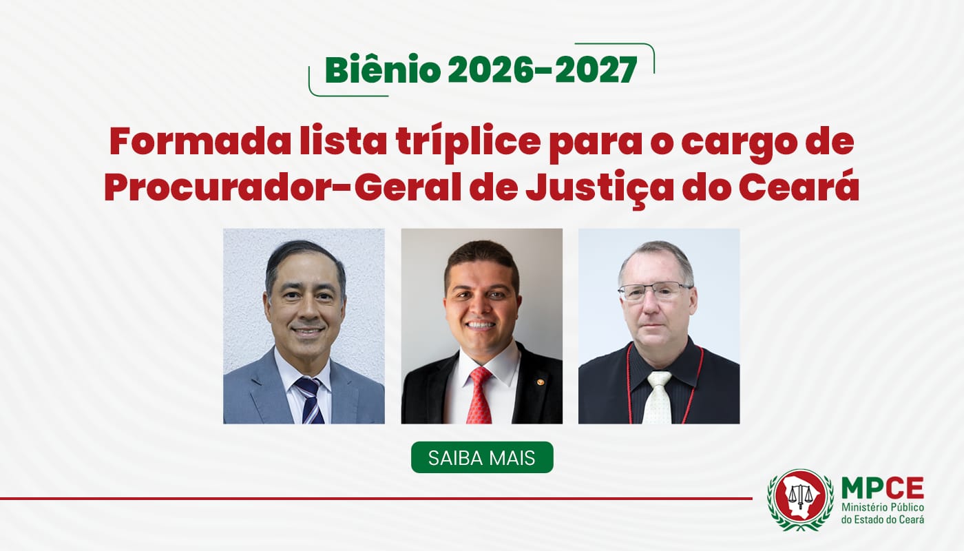 A Comissão Eleitoral divulgou, nesta sexta-feira (05/12), a formação da lista tríplice para o cargo de procurador-geral de Justiça do Ministério Público do Ceará – Biênio 2026-2027. Após nove horas de votação virtual, o resultado foi anunciado no Plenário dos Órgãos Colegiados, em Fortaleza. O atual procurador-geral de Justiça, Haley de Carvalho Filho, obteve 307 votos; seguido do promotor de Justiça Herbet Gonçalves Santos, com 204 votos; e do procurador de Justiça Luciano Percicotti Santana, com 77 votos. O pleito contou com a participação desses três candidatos e reuniu 452 eleitores, entre procuradores e promotores de Justiça ativos do MP do Ceará.