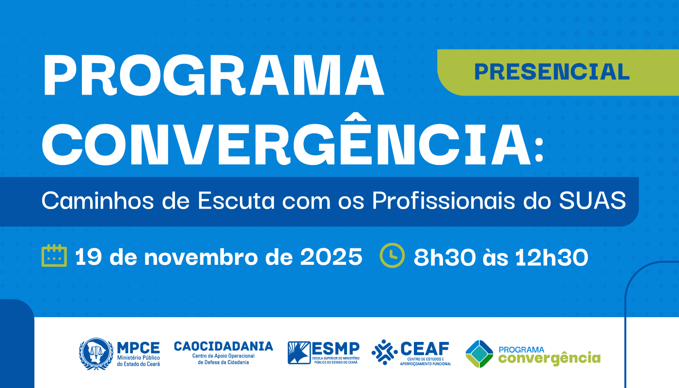 Evento: Programa Convergência: Caminhos de Escuta com os Profissionais do SUAS Data: 19 de novembro de 2025 Horário: 8h30 às 12h30 Carga horária: 4h Local: Auditório da Escola Superior do Ministério Público (Rua Maria Alice Ferraz nº 120, bairro Engenheiro Luciano Cavalcante, Fortaleza/CE) Modalidade: Presencial Aberto ao público Inscrições: https://cursos.mpce.mp.br