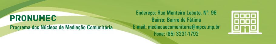 - Estimular a formação de Núcleos de Mediação Comunitária nos municípios do Estado do Ceará, estabelecendo parcerias entre o Ministério Público do Estado do Ceará e entidades públicas e privadas, de modo a proporcionar à comunidade o exercício efetivo da cidadania participativa;